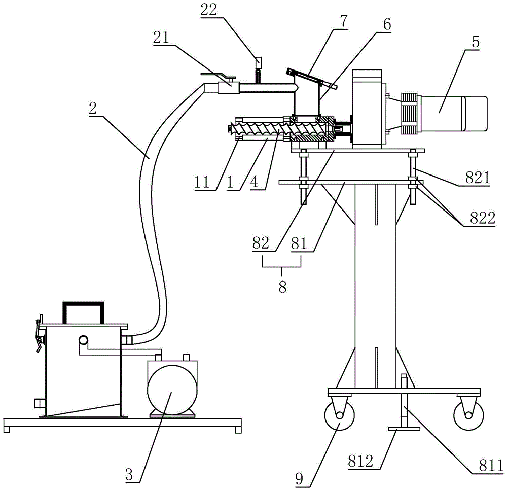 這次新型的上述技術(shù)是一種雙螺桿擠出的雙螺桿側(cè)邊真空排氣系統(tǒng),通過擠出機(jī)側(cè)壁連通的抽氣筒、抽氣管、真空泵。抽氣筒內(nèi)設(shè)有返料螺桿,筒上設(shè)有驅(qū)動電機(jī)。通過抽氣管跟抽氣筒對擠出機(jī)內(nèi)部開始抽氣,此時驅(qū)動電機(jī)工作并且驅(qū)動返料螺桿轉(zhuǎn)動,如果擠出機(jī)內(nèi)的部分物料,在負(fù)壓的作用下流進(jìn)抽氣筒內(nèi),返料螺桿就可以對物料作用一個向擠出機(jī)內(nèi)的推動力,能將物料再次推進(jìn)擠出機(jī)內(nèi),減少不必要的浪費,保證真空排氣系統(tǒng)運行正常!